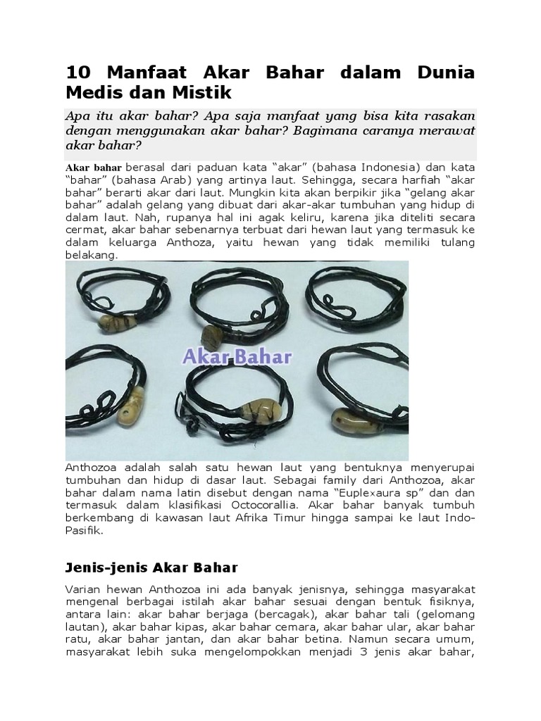 Nah demikianlah sekilas deskripsi mengenai apa itu akar bahar dan apa manfaatnya bagi diri kita secara medis maupun non medis. Akar bahar merupakan jenis anthozoa yakni hewan yang tumbuh di dasar laut dan terkenal sebagai obat penambah stamina sejak dulu. Indonesiƫrs sieren zich al generaties lang met de armbanden van akar bahar. Sebelum digunakan biasanya tumbuhan akar bahar dipanaskan hingga kaku dan dibentuk menjadi sebuah gelang.