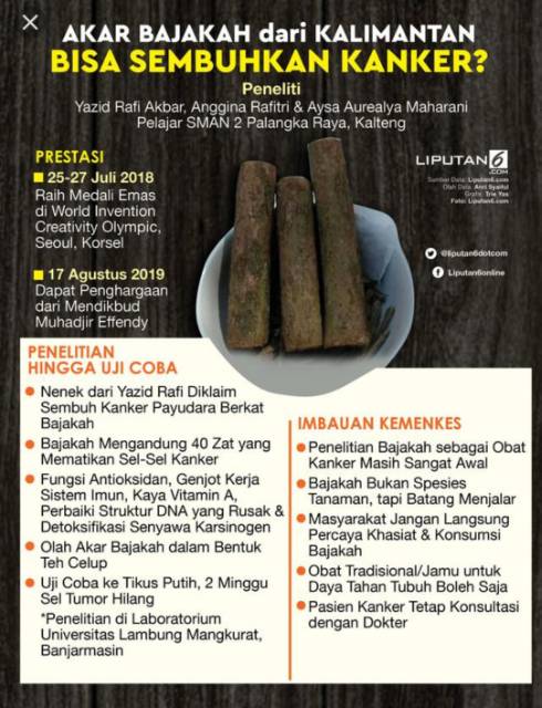 Karena itu beberapa waktu belakangan tanaman bajakah menjadi naik daun dan banyak diulas. Khasiat akar bajakah yang disebut sebagai obat kanker ini faktanya pernah dengar nama tanaman bajakah. Bajakah merupakan jenis tanaman merambat yang dapat di temukan di pedalaman hutan kalimantan. Sebab obat kanker dari akar bajakah ini diperkenalkan ke kancah internasional oleh siswa sman 2 palangkaraya dan dimenangkan dalam ajang youth national science fair ynsf 2019 di bali dan invention olympic wico di korea selatan.