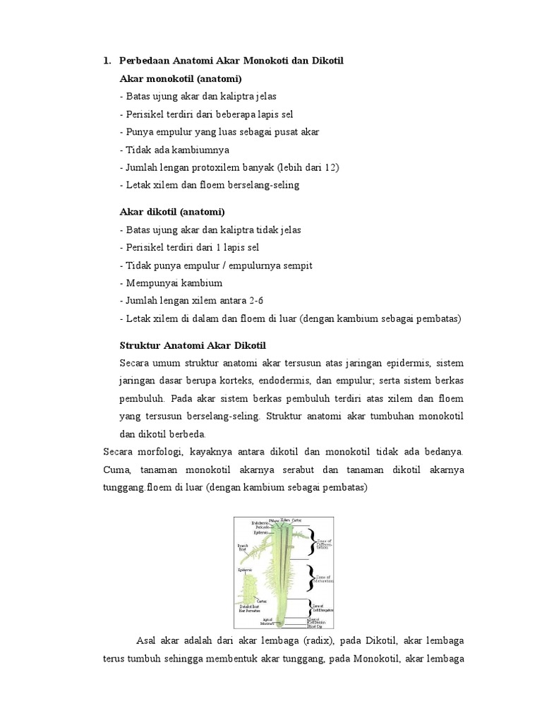 Secara garis besar tumbuhan dibagi menjadi dua kelompok yaitu tumbuhan monokotil dan dikotil. Baik jenis akar dikotil dan akar monokotil umumnya memiliki jaringan vaskular perisikel perikambium endodermis dan korteks dari pusat ke luar dari masing masing akar. Apa saja perbedaan struktur akar monokotil dan dikotil itu. Akar memiliki wilayah khas seperti daerah pematangan perpanjangan wilayah pembelahan sel dan tudung akar.