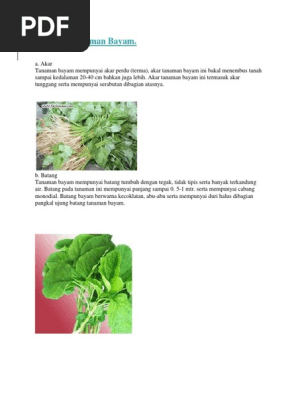 Contents1 pengertian bayam1 1 bahasa inggris bayam2 klasifikasi bayam2 1 nama latin bayam3 tanaman bayam4 ciri ciri tanaman bayam5 deskripsi bayam5 1 batang bayam5 2 daun bayam5 3 daun bayam duri5 4 akar bayam5 5 bunga bayam6 jenis bayam6 1 bayam merah6 2 bayam hijau6 3 bayam cabut6 4 bayam hutan pengertian bayam bayam merupakan tumbuhan yang berasal dari amerika tropik yang biasa dikonsumsi. Tanaman ini memiliki banyak jenis di indonesia antara lain jenis petik jenis cabut jenis berduri jenis daun merah serta jenis itik. Bayam memiliki sistem perakaran tunggang bagian bawah serta serabut pada bagian atas. Derajat keasaman tanah ph tanah yang baik untuk tumbuhnya adalah antara 6 7.